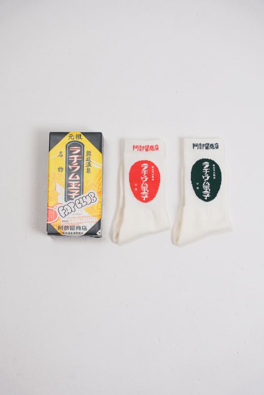 今回『阿部留商店』さんとの限定コラボアイテムとして、人気商品のラヂウム玉子商品に似せた、限定靴下を2色発売いたします!商品はラヂウム玉子同様に化粧箱にお包みしてお届けさせていただきます。 ※一部、阿部留商店さんEC・店舗でも販売