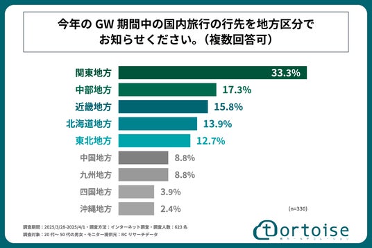 次に、「今年のGW期間中の国内旅行の行先」を問う設問への回答で最も多かったのは、1位が「関東地方」で33.3%、次いで2位が「中部地方」で17.3%、3位が「近畿地方」で15.8%という結果になりました。この結果から、東名阪という大都市圏周辺への旅行を予定している人が多いことが判明しました。