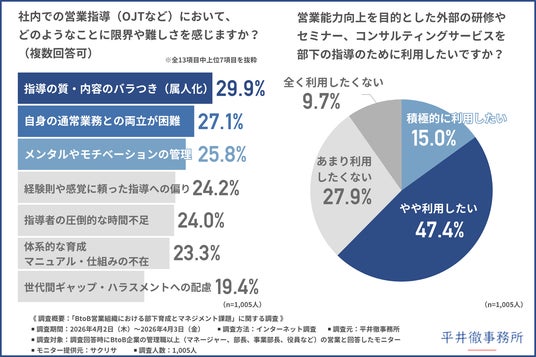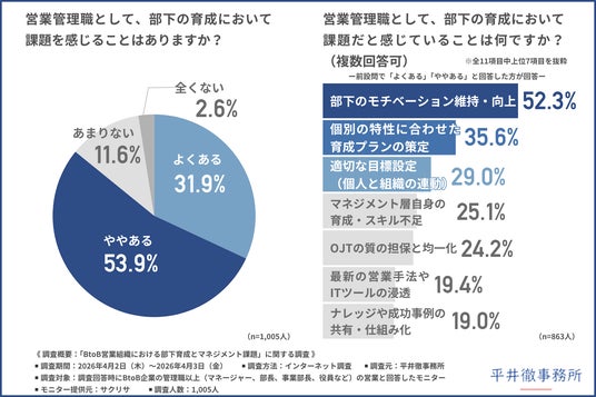 そこで今回、マネジメント支援サービスを提供する平井徹事務所(https://hiraitooru.com/)は、BtoB企業の管理職以上(マネージャー、部長、事業部長、役員など)の営業の方を対象に、「BtoB営業組織における部下育成とマネジメント課題」に関する調査を行いました。