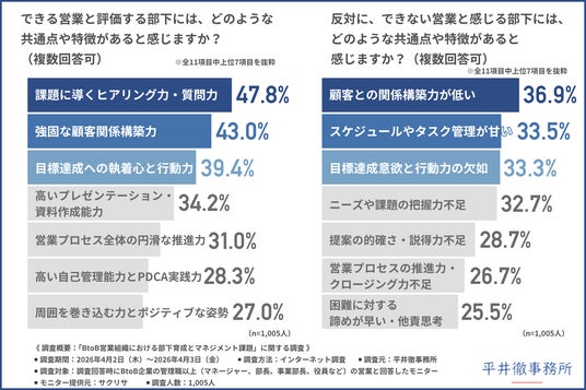 「できる営業と評価する部下には、どのような共通点や特徴があると感じるか」と尋ねたところ、『課題に導くヒアリング力・質問力(47.8%)』と回答した方が最も多く、『強固な顧客関係構築力(43.0%)』『目標達成への執着心と行動力(39.4%)』となりました。