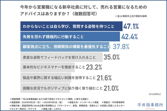 「今年から営業職になる新卒社員に対して、売れる営業になるためのアドバイスはあるか」と尋ねたところ、『わからないことは自ら学び、質問する姿勢を持つこと(47.1%)』と回答した方が最も多く、『失敗を恐れず積極的に行動すること(42.4%)』『顧客視点に立ち、信頼関係の構築を最優先すること(37.8%)』となりました。