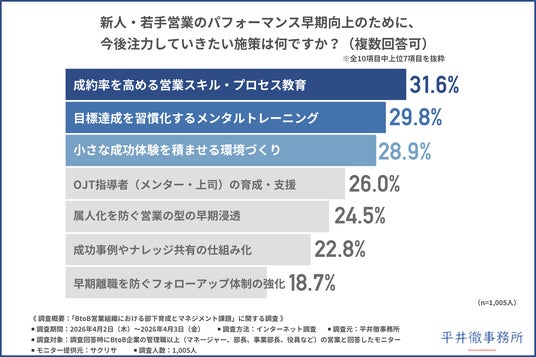 最後に、「新人・若手営業のパフォーマンス早期向上のために、今後注力していきたい施策は何か」と尋ねたところ、『成約率を高める営業スキル・プロセス教育(31.6%)』と回答した方が最も多く、『目標達成を習慣化するメンタルトレーニング(29.8%)』『小さな成功体験を積ませる環境づくり(28.9%)』となりました。