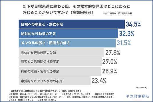さらに、部下が目標未達に終わる原因も「意欲」や「行動量」の不足、「メンタル」の弱さにあると思う方が多く、単なる営業スキルの伝授だけでは成果につながりにくい実態が明らかになりました。
