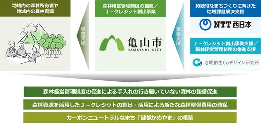 この度、森林経営管理制度の更なる推進を目的としたJ-クレジット創出・活用をめざしていくにあたり、令和5年7月10日に締結した「カーボンニュートラルなまち「健都かめやま」※2の構築に向けた連携協定」に基づいて、NTT西日本三重支店および地域創生Coデザイン研究所が事業支援を行うこととなりました。