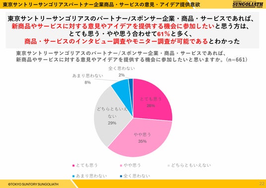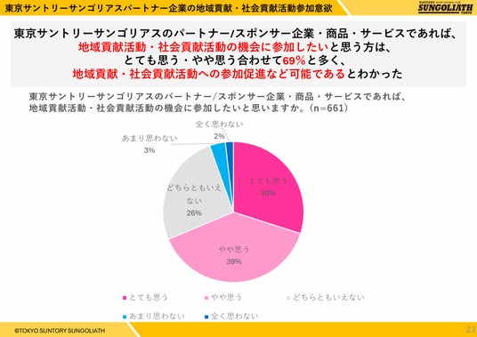 東京サントリーサンゴリアスファンにとって、東京サントリーサンゴリアスパートナー企業の商品・サービスは「安心・信頼しやすく」「購入意欲向上」につながることが明らかとなり、企業は東京サントリーサンゴリアスとのパートナーシップにより、ファンに対して商品・サービスの安心・信頼感醸成や、購買促進をすることが可能になると考えられます。またパートナー企業の新商品やサービスに対する意見やアイデアを提供する機会や、地域貢献活動・社会貢献活動の機会に参加したいというファンも多く、今後、東京サントリーサンゴリアス・パートナー企業・ファンとのコラボレーションの可能性が示されました。