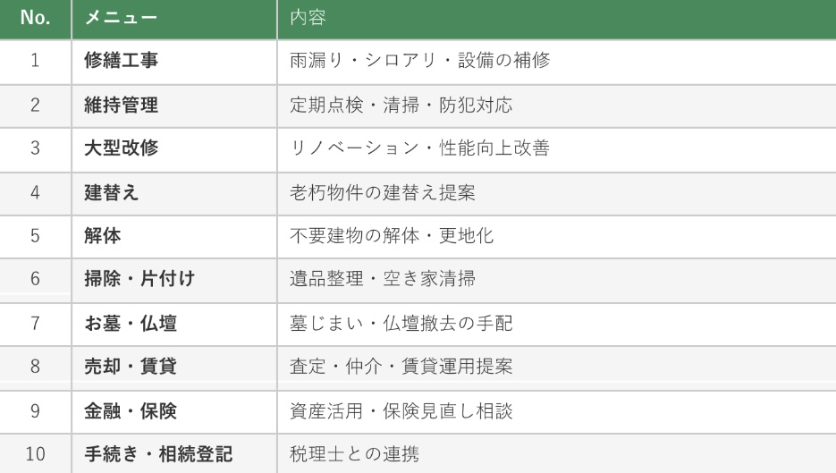 「いえつな」はお客様の資産価値を正しく把握し、「今、何をするべきか」を整理することから始めます。修繕から売却、相続まで、以下の10メニューをワンストップで提供します。