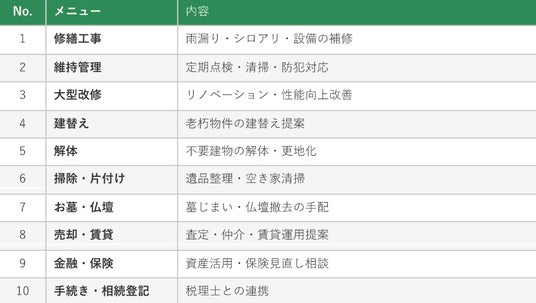 「いえつな」は、この“予備軍”の段階でアプローチし、修繕・売却・相続登記まで10の解決メニューをワンストップで提供。創業50年・LIXILリフォームショップ顧客満足度3年連続徳島県1位の実績と、地域のOB顧客との信頼関係を活かし、住まいの価値を次世代へ繋ぎます。