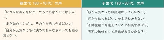 「いえつな」は、住まいのメンテナンスが必要な時期を迎えた親世代(60~70代)の「子供に負担をかけたくない」という想いと、子世代(40~50代)の「実家のこれからが心配」という想い、その両方に寄り添います。