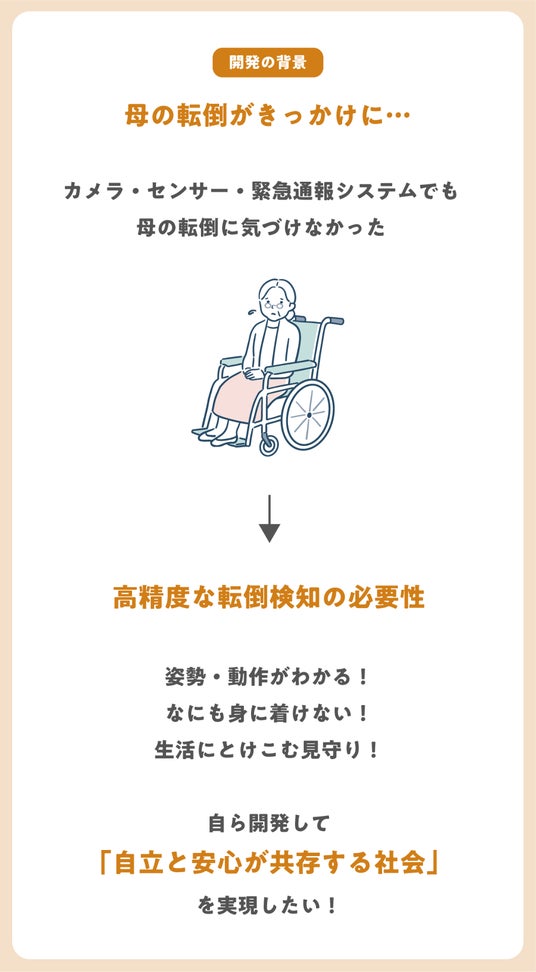 "親の転倒に気づけなかった痛切な経験から、このプロジェクトは始まりました。見守り装置を契約していたのに、なぜ母の転倒を防げなかったのか-その疑問が開発の原点です" (大槻代表)