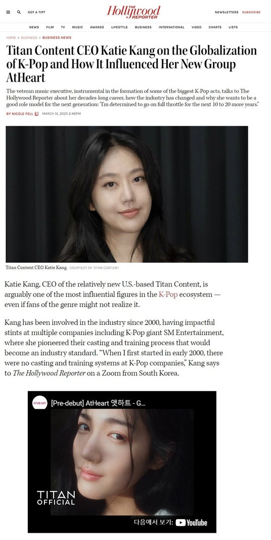 さらに、米国代表芸能メディアハリウッドリポーター(The Hollywood Reporter)が15日、女性の日を迎え、公式ホームページを通じてタイタンのカン・ジョンア代表のインタビュー記事を掲載した。 ハリウッドリポーターは、カン・ジョンア代表がK-POPアーティスト企画の中枢となるキャスティング、トレーニング、プロデューシングシステムを構築した創始者であり、数多くのグローバルスターを誕生させ、K-POPの世界化を引き出した業界最高の女性リーダーであり先駆者として名指しした。