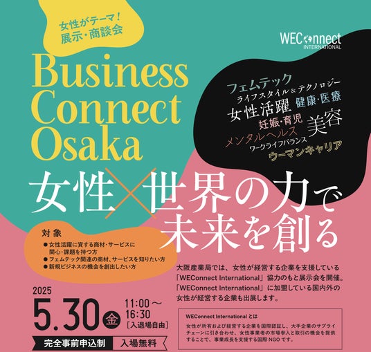 この度、公益財団法人大阪産業局は、国際NGO「WEConnect International」(※)との連携により、本展示会を開催します。現在開催中の『大阪・関西万博』では、「平和と人権」をテーマとした8つのテーマウィークの一つとして「女性の活躍推進」が掲げられており、本展示会もその趣旨に沿った取り組みです。 本展示会では、現代社会において女性が直面するさまざまな課題の解決に寄与する商材やサービス、また、グローバルな視点からの女性活躍推進の取り組みが体験できます。フェムテックを含む多彩なソリューションを提供する企業が出展し、国内外のネットワーク構築や新たな連携の可能性が広がる場として期待できます。