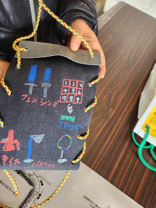 今回は、カンボウプラス株式会社様にご協力いただき、「廃材を利用したポーチ作り」を行いました。ポーチに紐を通した後、好きな絵を描いたり模様を加えたりしながら、世界に一つだけのオリジナルポーチを制作しました。