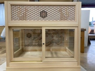 展示ケージは地元真庭市、【木製スーパーカー】で世界を驚かせた「佐田建美」(https://sadakenbi.com/)に制作依頼し、真庭組子で白蛇等を表現し、参拝される方々への運気上昇、無病息災を願った縁起の良い図案を施した唯一無二の出来映え。