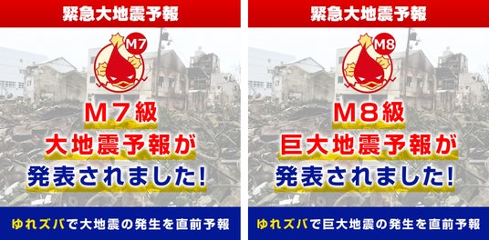 図2 緊急大地震予報画像(サンプル画像・左図:M7級大地震予報、右図:M8級巨大地震予報)