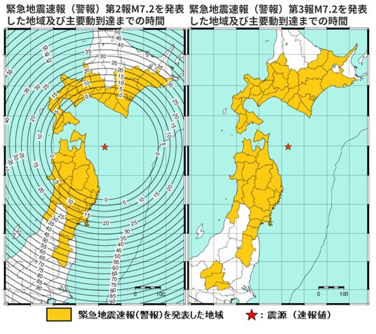 「緊急大地震予報」は臨時大地震予報配信の前日12月7日11時00分より、運用開始以来初めて発動されました。予知・予報された地震規模がM7級であったため、図1左図のM7級緊急大地震予報画面が配信されました。1日目は被災想定地域である北海道、青森県、岩手県の3県へ集中的に配信され、2日目の12月8日は全国向けに一斉配信・拡散されました。