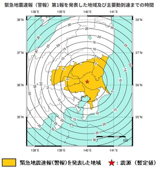 図6 2026年4月1日茨城県南部地震の緊急地震速報(警報)発表地域及び主要動到達までの時間 (出典:気象庁ホームページ2026年4月1日)