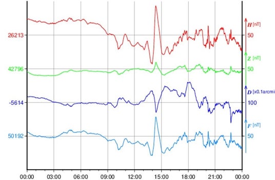 図3 地磁気異常の観測波形(北海道北部観測点2025年12月3日(UTC))