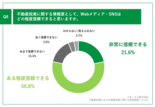 「Q5.不動産投資に関する情報源として、Webメディア・SNSはどの程度信頼できると思いますか。」(n=111)と質問したところ、「非常に信頼できる」が21.6%、「ある程度信頼できる」が