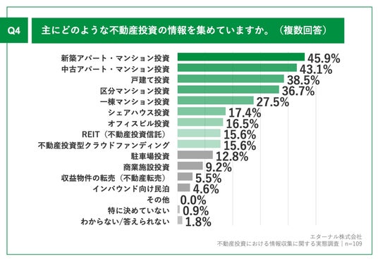 Q1で「特に情報収集はしていない」「わからない/答えられない」以外を回答した方に、「Q4.主にどのような不動産投資の情報を集めていますか。(複数回答)」(n=109)と質問したところ、「新築アパート・マンション投資」が45.9%、「中古アパート・マンション投資」が43.1%、「戸建て投資」が38.5%という回答となりました。