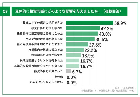 Q6で「非常に影響を与えている」「ある程度影響を与えている」と回答した方に、「Q7.具体的に投資判断にどのような影響を与えましたか。(複数回答)」(n=90)と質問したところ、「投資エリアの選定に活用できた」が58.9%、「収支計算の方法を学べた」が42.2%、「投資物件の選定基準の参考になった」が40.0%という回答となりました。