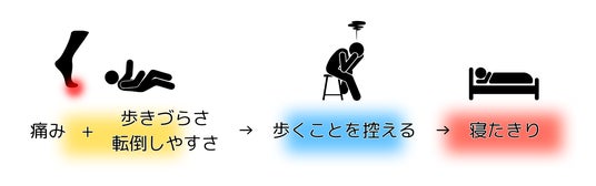 我々が歩くためには筋肉からの推進力を地面に伝える必要があり、そのためには足の指で地面をつかめなくてはなりません。しかし、足にトラブルや痛みがあるとうまく地面をつかむことはできなくなります。