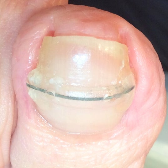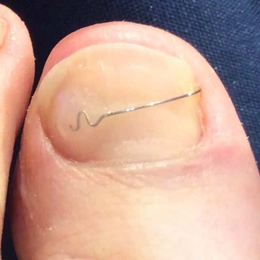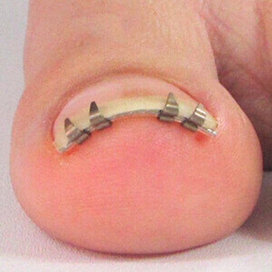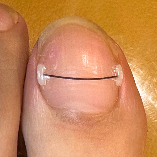 巻き爪の根本的な解決には爪の巻く力と床反力のバランスを整えることが重要です。その手助けとして、爪の上から巻く力を弱める器具を装着いたします。さまざまな器具が存在しますが、一度に大きな力で矯正すると、爪が割れたり、剥がれたり、逆に強い痛みが出ることがあるので、症状や状態に適した器具で適した力で装着する必要があります。