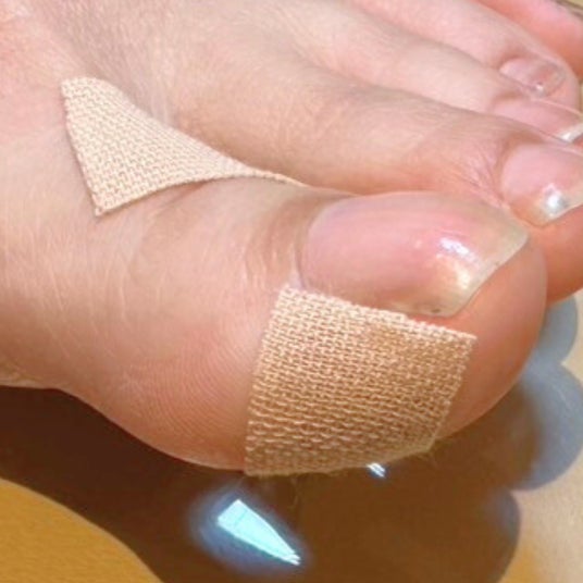 爪が巻いて、肉への食い込みが強い場合、指の皮膚に対し、テーピングテープを使って、らせん状に下に引っ張ることで、お肉と爪が離れ爪が皮膚に与える圧力を弱くする方法です。