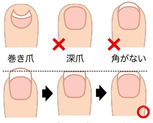 正しい爪の切り方を習慣にすることで巻き爪の予防になります。皮膚から水平にカットし、角を残すような「スクエアカット」がおすすめです。ポイントは爪の左右の端を切り過ぎないようにすること。曲線ではなく、まっすぐ四角形にカットします。