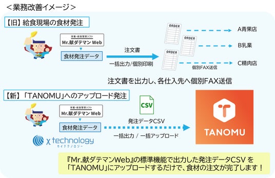 株式会社カイテクノロジー(本社:東京都新宿区内藤町87大木戸庁舎6F、代表取締役:勝屋嘉恭、以下 当社)が提供する栄養・給食管理ソフト『Mr.献ダテマンWeb』が、卸業者の販促・受発注システム「TANOMU」(タノム)の食材注文データ連携様式に標準対応致しました。