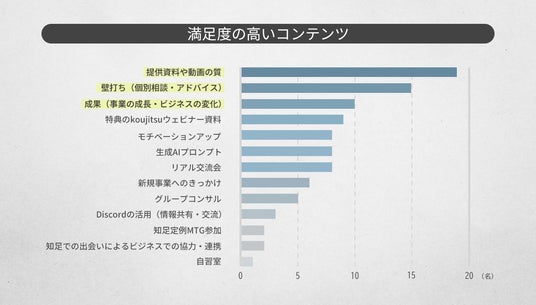 受講生から特に高い評価を得ているのは、「提供資料や動画の質」「壁打ち(個別相談・アドバイス)」「成果(事業成長・ビジネスの変化)」です。