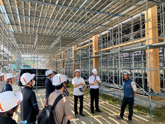 本ツアーでは、2025年末の完成を目指して現在建設中の新拠点「KASAI SUSTAINABLE BASE」の工事現場を、建築士による解説付きでご案内しました。同拠点は雨水の再利用や兵庫県産材を活用した環境配慮型の物流拠点であり、1番の見所である無柱工法を採用した木造倉庫の寸法は横幅約78m、奥行約25m、高さ約12m、建物のひさしは約8mとなります。