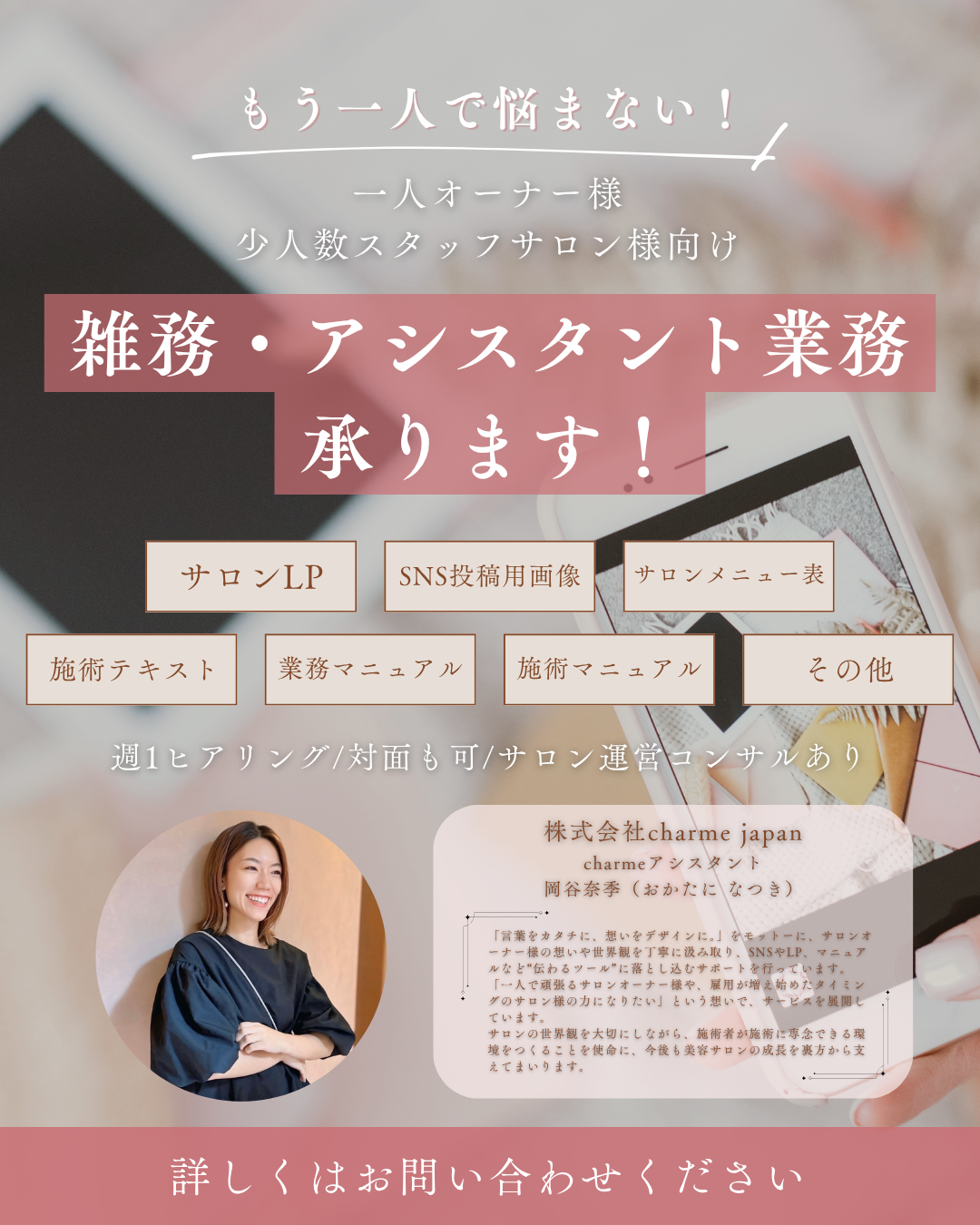 charmeオーナーも施術やお客様との時間に集中したい一方、SNS更新やリール制作、業務の統一などに頭を悩ませていました。そんな中、元々charmeのお客様であった、フリーランスでSNSプロモーション業務を行う現スタッフの岡谷奈季氏に裏方業務を依頼しました。