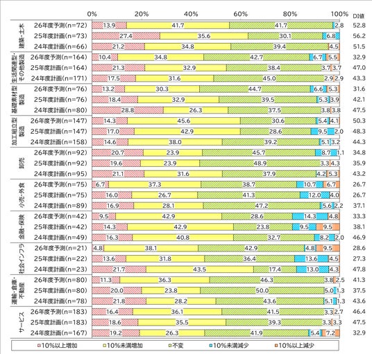 業種グループ別では、「建築・土木」のDI値が25年度計画で56.2ポイントと、24年度以降一貫して全業種で最も高い水準を維持しています。