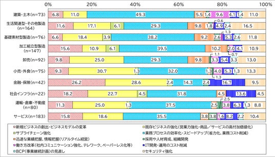 IT投資で解決したい現在直面している経営課題は、全体では「業務プロセスの効率化・スピードアップ」が34.6%で最多です 。しかし業種別に見ると、「建築・土木」では効率化への期待が49.3%と突出する一方、「金融・保険」では「既存ビジネスの強化(28.6%)」や「新規ビジネスの創出(26.2%)」が上位を占めています。各業界が置かれた状況に応じ、ITの活用フェーズを深化させている実態が浮き彫りとなりました。