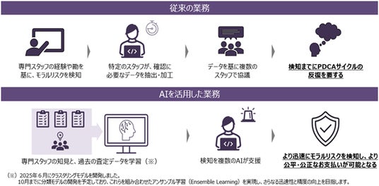 従来の業務では、疑わしい請求の検知までに時間やマンパワーを要するほか、その精度や優先度の評価が不明瞭という課題を抱えていましたが、専門スタッフの知見と過去の査定データをAIが学習することで、専門スタッフが培った経験やノウハウを体系的に集約し、より高度で効率的な検知が可能となります。