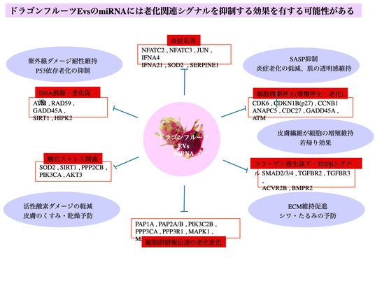 レッドドラゴンフルーツに由来するエクソソームには、紫外線によるMAPK応答経路の抑制する機能があることがわかり、また、老化に関連するシグナル抑制をするmiRNAを含んでいる事から、老化抑制に大きく期待ができる新規原料である。
