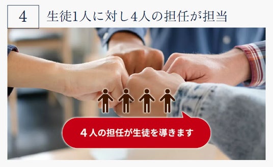 生徒1人に対して、4人の担任がつく「チーム担任制」を導入しており、主任講師・教務担任・授業の担当講師・副担任のそれぞれが連携を取りながら生徒を徹底的にサポートしていきます。
