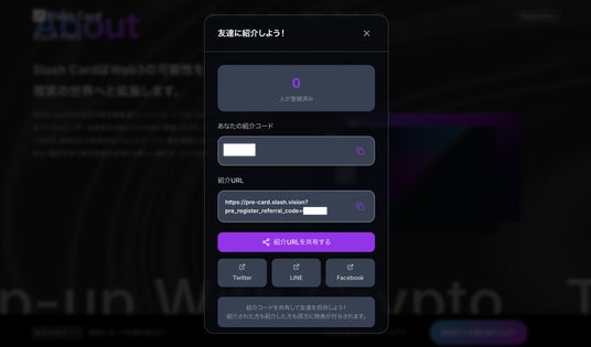 「Slash Card」のクローズドβ版に事前登録されたユーザー様は、紹介コードを発行いただけます。 この紹介コードを通じて新しいユーザー様が登録された場合、紹介元のユーザー様には将来的なインセンティブをご提供する予定です。※ランキング/ポイント制度の詳細については登録者数の状況を鑑みて、後日公表いたします。