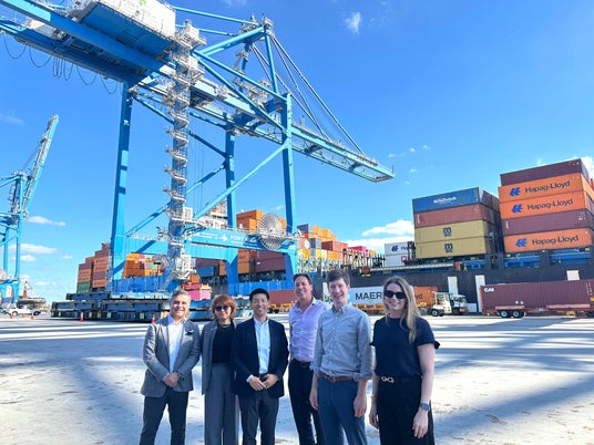 2026年3月、ニューオーリンズ港にて。ニューオーリンズ港湾局 エイドリアン・ロペス・サラザール氏、当社 水野恭子、山崎満広、駐オーストラリア代表 スティーブ・バーグ氏、ニューオーリンズ世界貿易センター ハリソン・クラブトゥリー氏、ナタリー・モローニー氏(左から)とともに。