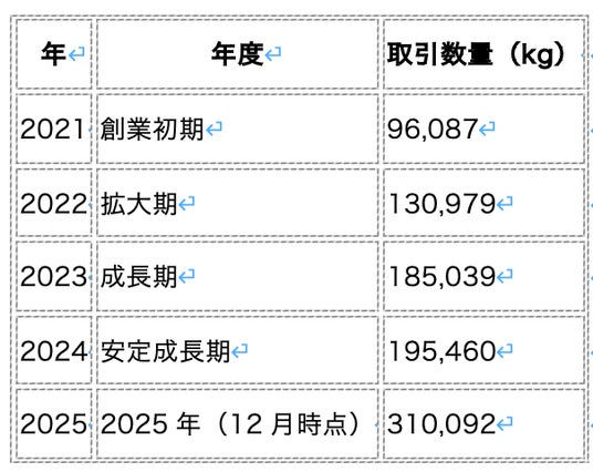 買いクルチェーン内の公式データでは、同社の取引量はこの5年間で約3.2倍、取引額は買いクルチェーン発足後から13,068%に拡大。2025年の輸出数量は31万kg超(2025年12月1日現在)に達している。