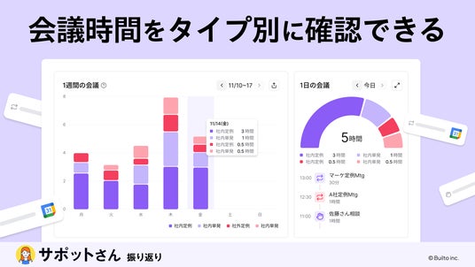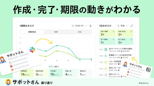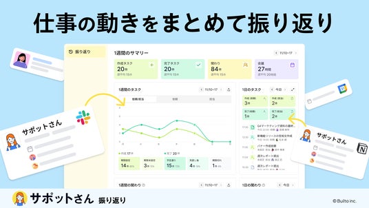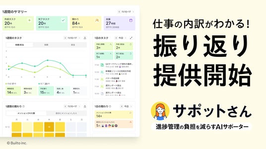 進捗管理の負担を減らすAIサポーター「サポットさん」は、Slackで作成したタスクや受け取ったメンション、Googleカレンダー連携で会議の動きを確認できる新機能「振り返り」を提供開始しました