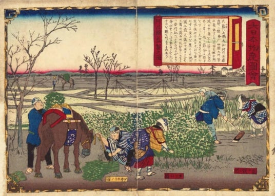 【藍】江戸時代より徳島は藍の中心地。吉野川流域で作られた「阿波藍」は特に上質とされてきました。(「大日本物産図会 阿波国藍製之図」国立国会図書館)
