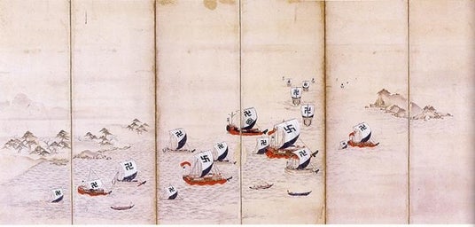【木工】阿波水軍を支えた船大工の技術が戦後に仏壇づくりへ受け継がれ、唐木仏壇の一大産地となりました。(「参勤交代渡海図屏風」徳島城博物館蔵)