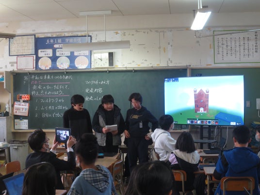 剣北小学校(福岡県鞍手町)では、東京大学教育学部の新藤准教授より学術指導を受けながら新しい授業モデルに取り組んでいる。11月に訪問した長崎への修学旅行で得た学びを基盤とし、ICTツール(教育版マインクラフトおよびプログラミング教材V-code)を用いて仮想空間に平和な街を再構築する取り組みを進めている。