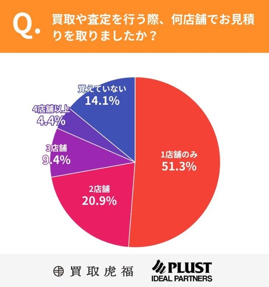 まず、買取や査定を行う際に「何店舗で見積もりを取ったか」を尋ねたところ、51.3%が「1店舗のみ」と回答し、最も多い結果となりました。