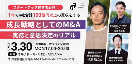 業界特化型ソフトウェアグループの株式会社SIVA(本社:東京都港区、代表取締役CEO:杉浦稔之、以下「SIVAグループ」)の杉浦稔之は、3月30日(月)に開催されるLeading Startup Square(LSS)主催のイベント「スタートアップ経営者必見!1年で4社合計100億円以上の買収をする成長戦略としてのM&A ―実務と意思決定のリアル」に登壇することをお知らせします。