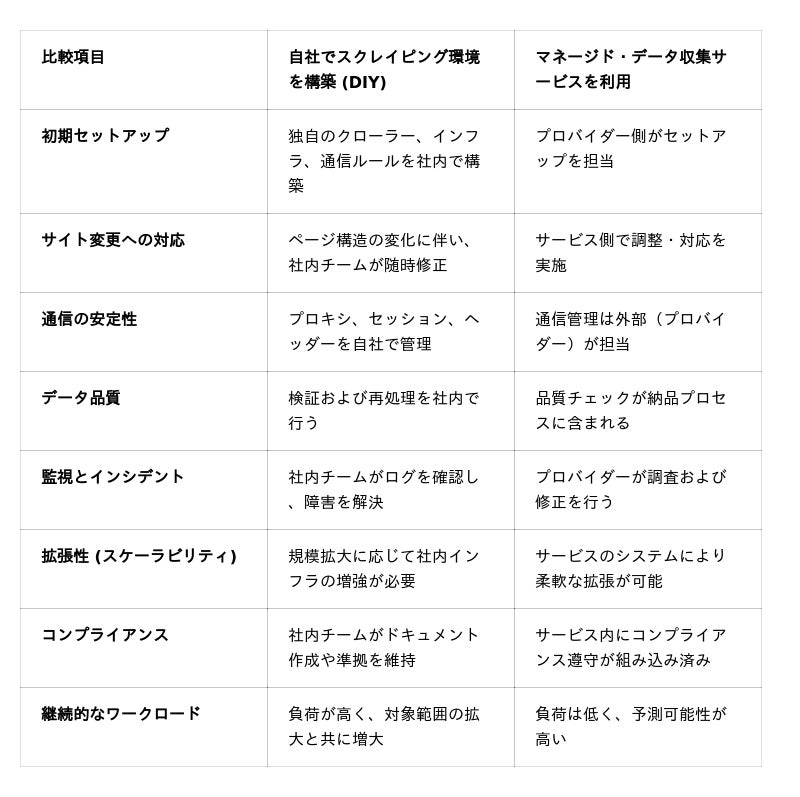 - 社内エンジニアをクローラーのメンテナンスではなく、AI開発や分析業務にシフトさせたい場合。