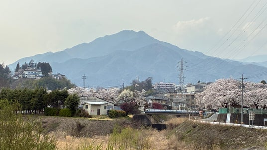 朝、窓を開けると山の稜線が見えます。電車は1時間に1本。コンビニに行くにも車に乗る風景が日常です。