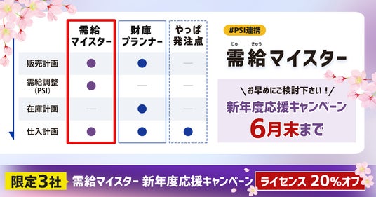 新年度に向けたシステム検討が活発化するなか、この度、シームレスな生販在(PSI)連携を実現する『需給マイスター』を対象に「新年度応援キャンペーン」を実施いたします。