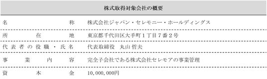 株式会社金宝堂ホールディングス(本社:東京都渋谷区、代表取締役:仲村 和明、以下「当社」)は、株式会社ジャパン・セレモニー・ホールディングス(本社:東京都千代田区、代表取締役:丸山 哲夫、以下「JCH」)の全株式を取得(以下「本株式取得」)し、2025年12月30日付でJCH及びJCHの完全子会社である株式会社セレモア(本社:東京都立川市、代表取締役:中川 貴郎、以下「セレモア」)を完全子会社化いたしましたので、下記の通りお知らせいたします。
